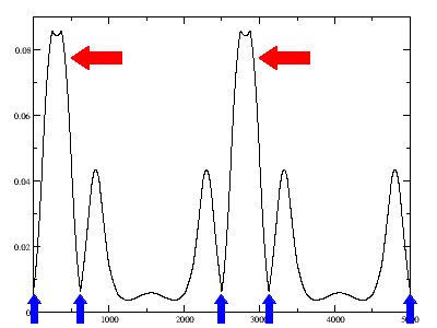 We can learn quite a lot from this graph. Looking at the input file, we see that we have a silicon atom at the origin and another ¼ along the diagonal. We note also that there is almost no density at the origin. By doing the line in the [111] direction, we have crossed the first silicon-silicon bond which we can see as a large density peak indicated by the red arrows.