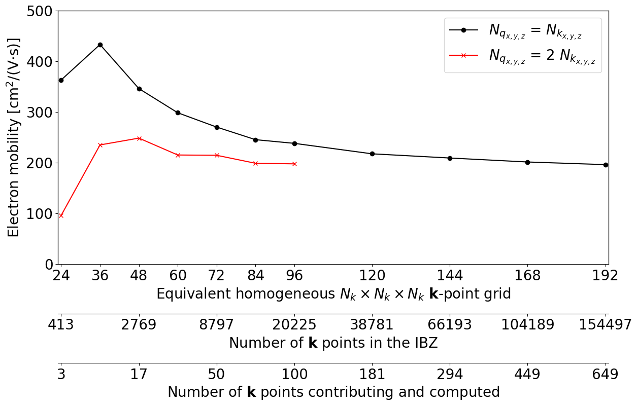 The SERTA mobility obtained at 300 K is 163.84 cm^2/V/s. Using a 48×48×48 \qq-mesh for the matrix elements as well would give 96.97 (using sigma_ngkpt 24 24 24). The result is indeed improved, since using a 24×24×24 mesh both for electrons and phonons gives 379.06. You can also use a finer mesh, but always multiple of the initial coarse mesh (in this case, 72×72×72, 96×96×96, etc). It is worth noticing that, according to our tests, there is very little use to go beyond a mesh three times as dense as the coarse one. Using a 72×72×72 fine mesh for the energies gives a mobility of 152.30 cm^2/V/s, and a 96×96×96 mesh leads to 149.38 cm^2/V/s: the improvement is indeed rather limited.